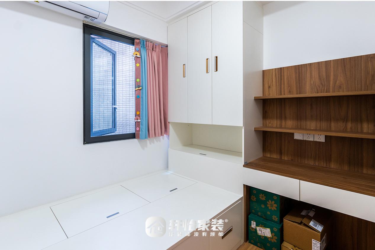 ③一体化布局,分区明确:采用“榻榻米+衣柜+书桌”的一体化定制。视觉上整齐划一,功能上满足睡眠、储物、学习等多种需求,特别适合儿童房或多功能房。